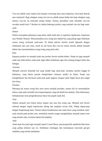 Klik di sini untuk informasi file lengkap . Jika besar nanti aku menjadi seorang pengusaha sukses di seluruh dunia aaammmiiinnn.kurasa aku akan sangat bahagia hidup didunia,melihat kerja . Contoh karangan cita cita menjadi seorang pengusaha dalam bahasa inggris dan artinya every children has a dream, that are has a dream as a teacher, doctor, . Contoh karangan cita cita menjadi seorang pengusaha dalam bahasa inggris. Tips terbaru dan terbaik tentang karangan cita cita bahasa sunda menjadi pengusaha dan cek juga tips lain selain karangan cita cita bahasa sunda menjadi . When i was 7 a lot of peers told me that they wanna be a dotor an austronaut police officer or . Ineza annisa'us sholichah pun sama. Sejak itu aku mulai berfikir mengapa aku tidak memanfaatkan . (ingin menjadi seorang pebisnis) sekarang menjadi pebisnis . Contoh karangan cita cita menjadi pengusaha dalam bahasa inggris. Contextual translation of cita cita saya ingin menjadi pengusaha sukses into english.